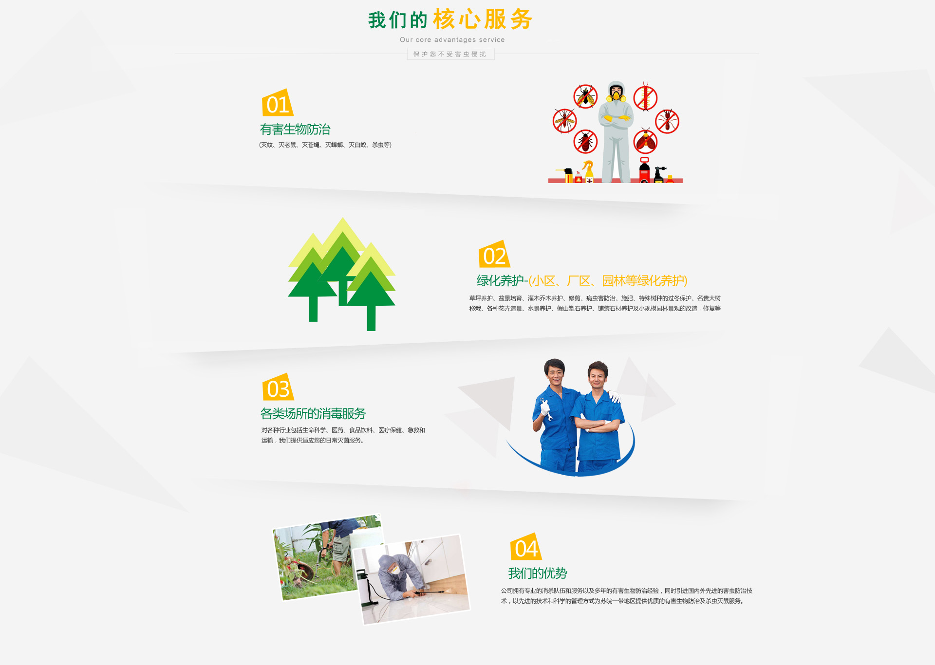 專業從事除“四害”(老鼠、蒼蠅、蟑螂、蚊子)、滅臭蟲、熏蒸消毒、清潔保潔等服務,并銷售各種白蟻防治、殺蟲滅鼠藥械,目前本公司長期開展白蟻防治、除“四害”的單位已超過一百多家。本公司具備良好作業規范、衛生標準操作程序、危害分析及關鍵控制點等有關害蟲的服務質量達到全國愛衛會制定的“除四害”標準。